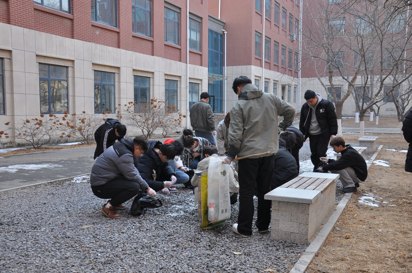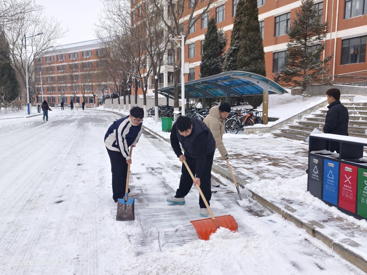 面对前一晚突降的大雪,学院老师和志愿者同学们积极行动,认真清理主干道积雪,消除出行安全隐患,保障师生通行顺畅。